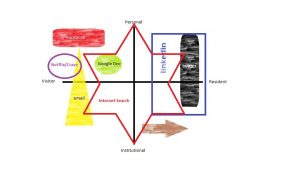 The internet is a ubiquitous reality today and a reflection on how and we use it is an interesting study. As a visitor to the internet represented by the left half of the continuum I search for information, entertainment, and use direct communication tools. The expectation is that we leave a small digital footprint and it is not a particular visible activity Fields (2012). The right side of the continuum has permanence as the information is more durable in nature, information resides in spaces for other to interact. Personal and Institutional are representative of the persona of identity and the continuum is expressed by the vertical axis. Mapping your use is a great aid in understanding of your personal online persona and the resilience of your contributions in the digital world.