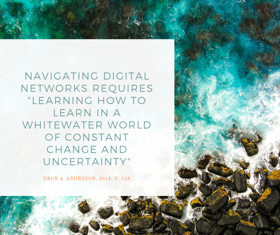 Participation in digital communities, as Veletsianos (2016) calls them, is determined by this new participatory culture, which “shifts the focus of literacy from individual expression to community involvement” (Jenkins, 2009, p. xiii). Contribution to these communities is defined by the participation and invites feedback, as well as contribution, thus producing “networked learners”, who “through participation in networks that reify their interactions, are almost always “prosumers”—people who both consume and produce network content” (Bruns, 2008, as cited in Dron & Andreson, 2014, p. 144). Therefore content creation and contribution to the networks are “pivotal in providing tools for knowledge construction and tools for sharing and expanding on that knowledge” (p. 144).