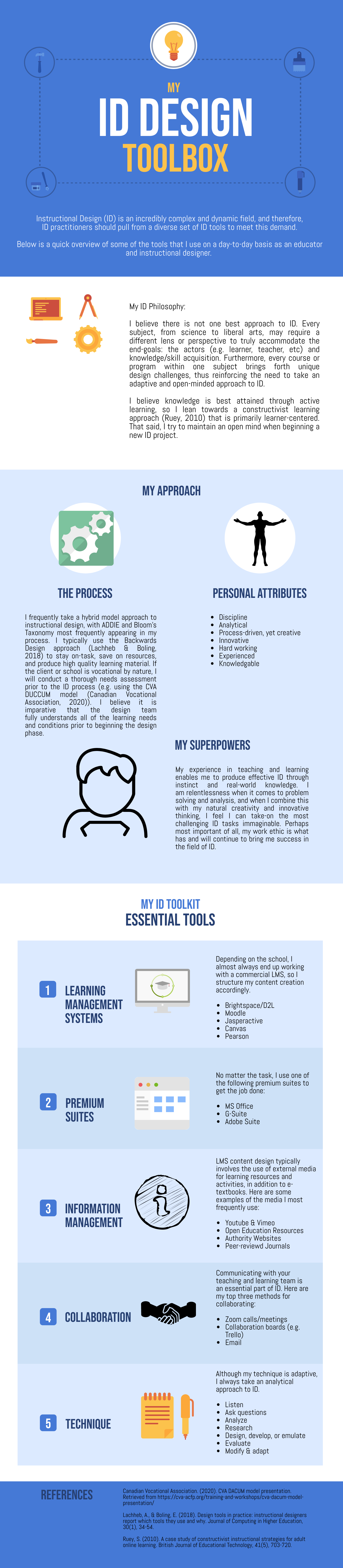 This week I am tasked with showcasing a few of my instructional design (ID) tools and tricks, along with some personal attributes I feel have enabled my success in the field of ID. I decided to create a basic infographic to illustrate my ID process. By no means does this infographic represent a complete list of my ID tools; rather, it reflects some of my most frequently used tools and resources, from a high-level perspective.