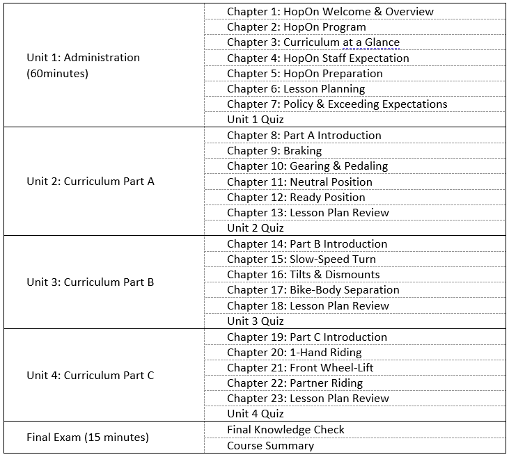 After seven years of development, Cycling BC, a member organization of Cycling Canada, recently launched the new HopOn instructor training tool and physical literacy curriculum for young cyclists across the country. Inspired by existing programs, like Run Jump Throw Wheel, JackRabbits, and the 60-minute kid’s club, HopOn builds upon recent interest in physical literacy (Google Ngram Viewer, 2021) to give instructors and participants tools that help pattern fundamental movements and build confidence through sport. This design case explores the author’s instructional design process during the multi-year development of the instructor tool. In addition, it offers insights that may inform the development of similar programs in the future (Paulus & Spence, 2010). The final product includes an Articulate360 eLearning module hosted on a user-friendly Learning Management System (LMS). In addition, it provides multi-modal videos, laminated cheat sheets, digital textbooks, and the option for printed resources and continued mentorship.