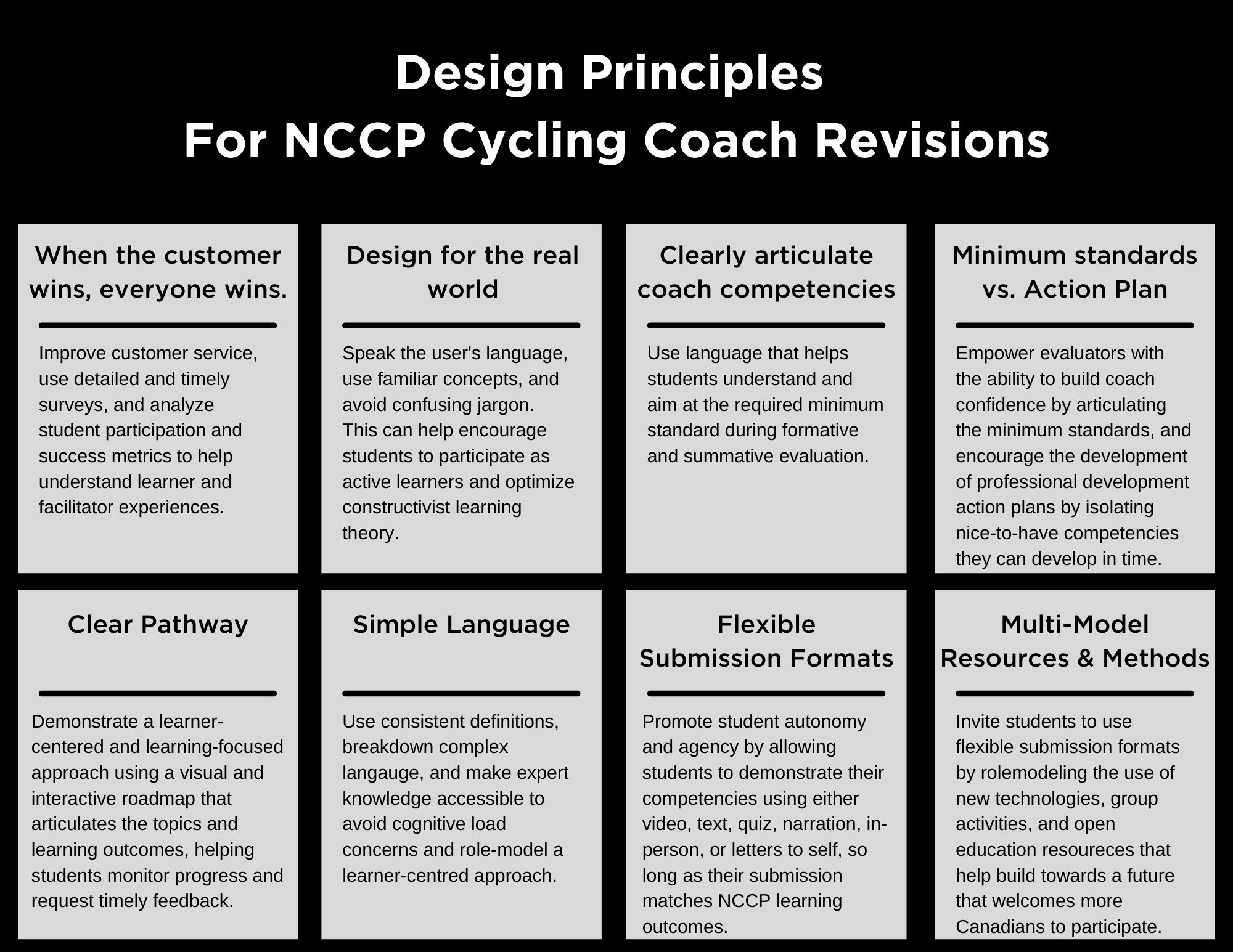 Creating design solutions in complex systems requires an investigative and empathetic inquiry. Both authors acknowledge their personal experiences impact the proposed design solutions, with the humble understanding that factors outside their scope may negate the ability of coaching organizations to implement these suggestions. With great appreciation for the work of coach developers across the country, our proposed updates aim to acknowledge the world-renowned status of the NCCP and help it maintain its position as a world leader in coach education despite these cultural and technological fluid times.