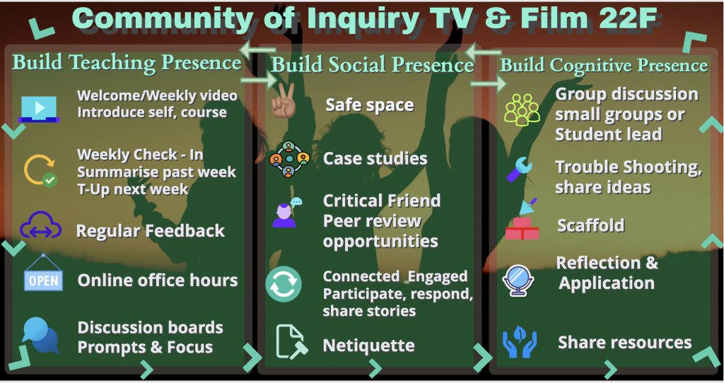 It is felt that creating a Community of Inquiry (COI) lays the foundation for a positive educational experience for students (and possibly faculty as well). Bird, Butler & Naylor (2021) found, for students, the relationship they had with faculty, along with feeling supported, impacted the quality of the educational experience students had. “An important pedagogical and policy implication of our research is how prevalent the themes of personal relationships, support and quality of teaching are to students” (Bird, Butler & Naylor 2021, pg. 861). The COI model calls for three presences, which, as we know through our readings are teaching, social and cognitive (Cleveland-Innes, Garrison, Vaughan 2013). In my context and experience as a TV & Film Professor at Fanshawe College in London, I would agree that creating a working COI does support more positive learning outcomes and a more positive learning experience. Keeping the aforementioned in mind, I chose to create an infographic which underscores the cyclical journey of teaching and learning in TV & Film and what strategies would work or have worked.