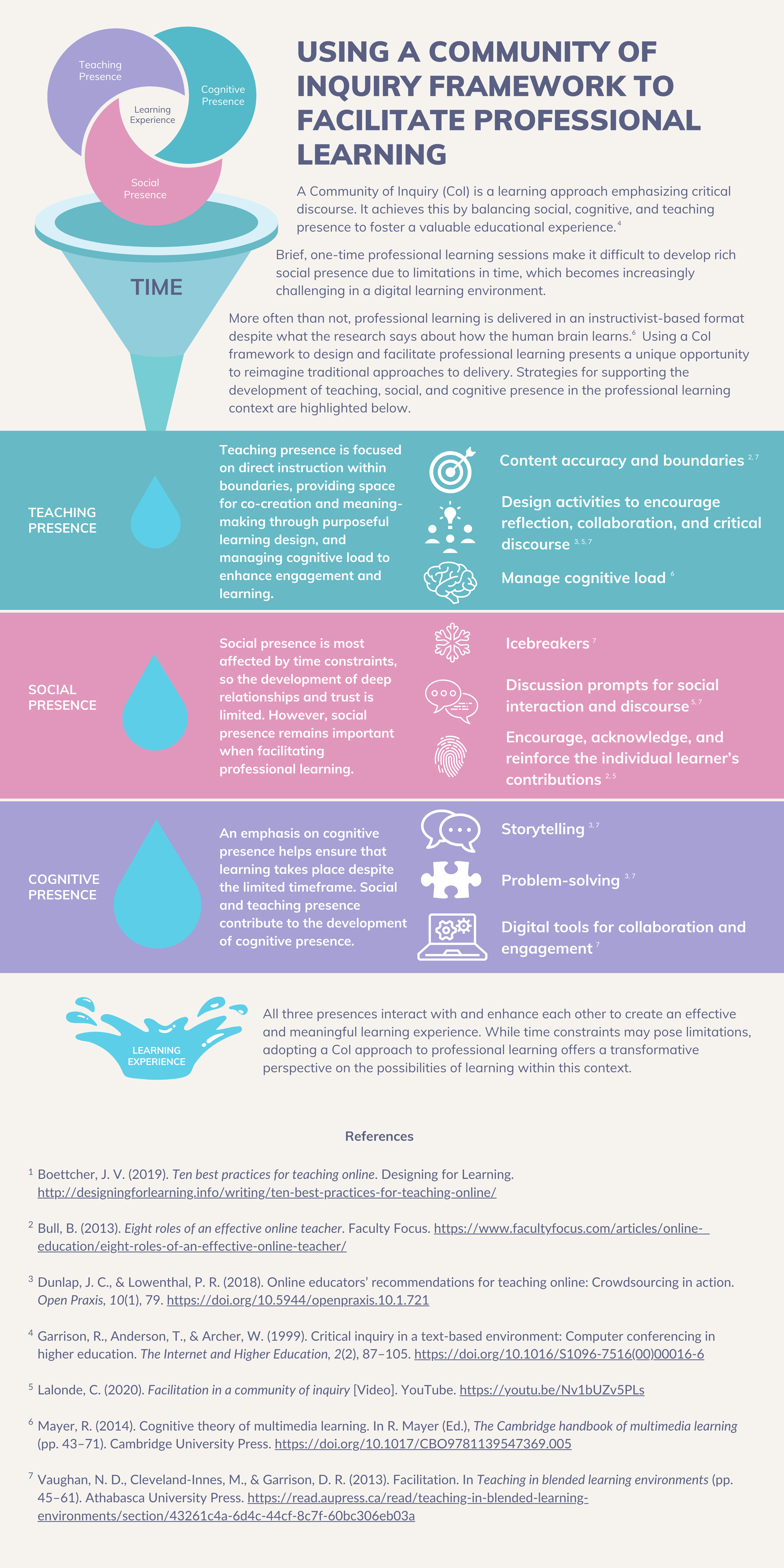 I really loved your approach focusing on one-time professional learning sessions because while I agree that the COI framework brings such a value through learner-centred education, that can be hard to achieve in the condensed amount of time provided for one-time professional training sessions. Your infographic with the funnel was a great visual representation of this.