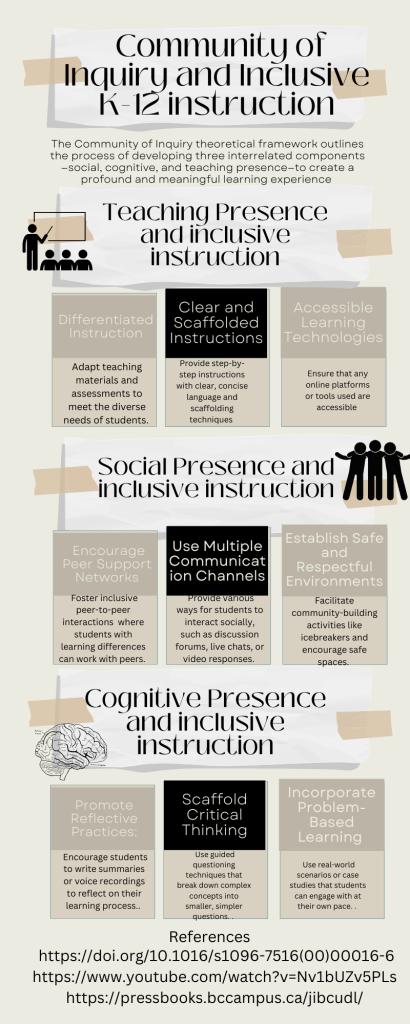 The Community of Inquiry (CoI) framework, as stated by Garrison et al. (1999), provides a foundational model for creating meaningful learning experiences through the integration of Teaching, Social, and Cognitive presences. As an instructor working with students from kindergarten to Grade 12, I chose to focus on how to implement CoI framework especially to students with learning differences and explore strategies tailored to address diverse learner needs.