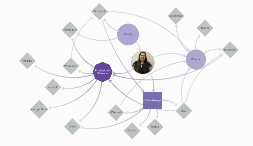 When making this visual version of my networks, it allowed me to reflect further on how these are interconnected with varying parts of my life. Using Kumu, I situated myself in the middle of the map, I decided to keep it to four categories that fanned out from the centre: family, friends, online groups, professional networks.